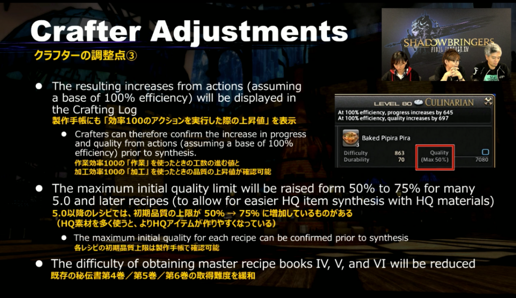 - 5.0以降のレシピでは、初期品質の上限が増加しているものがある(50%→75%)