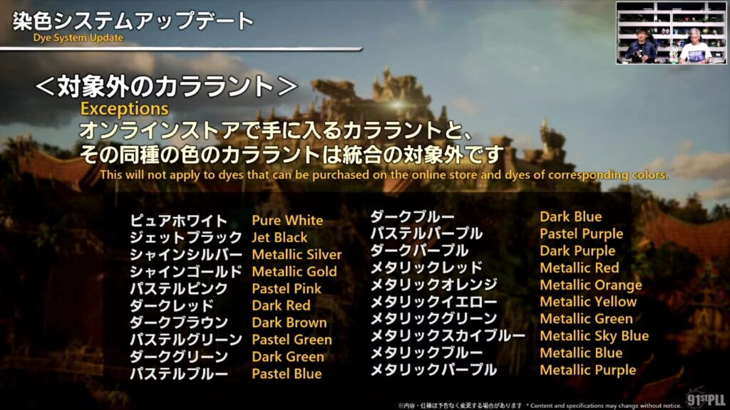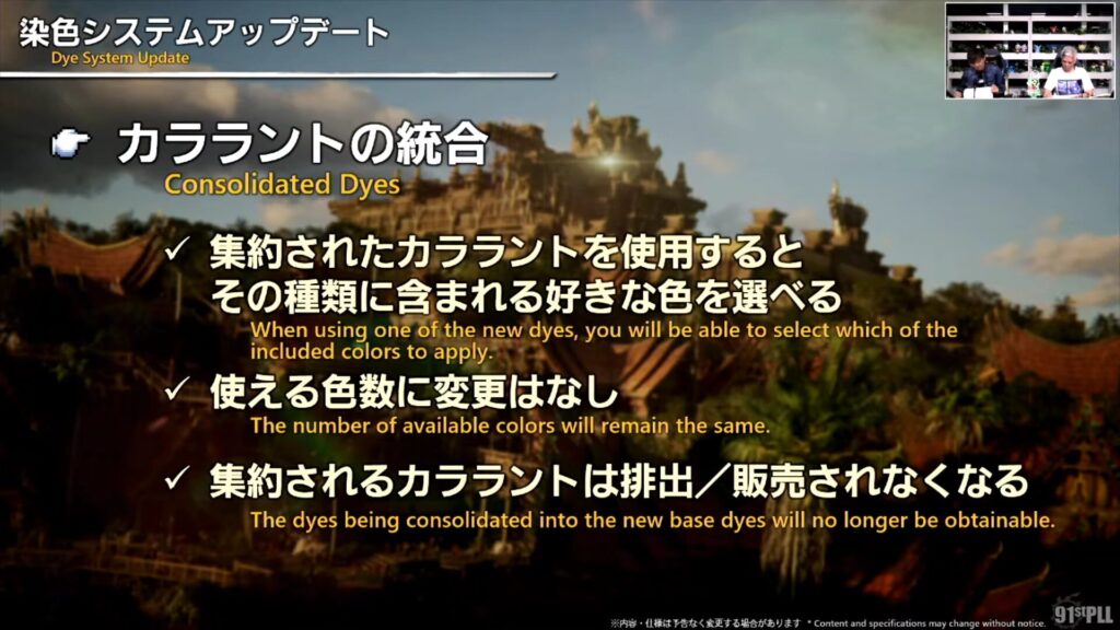 パッチ7.5では、染色システムの大幅なアップデートが予定されています。これまでたくさんの種類があった「カララント」が統合され、3種類に集約されます。なお、オンラインストアで手に入るカララントは対象外とのことです。