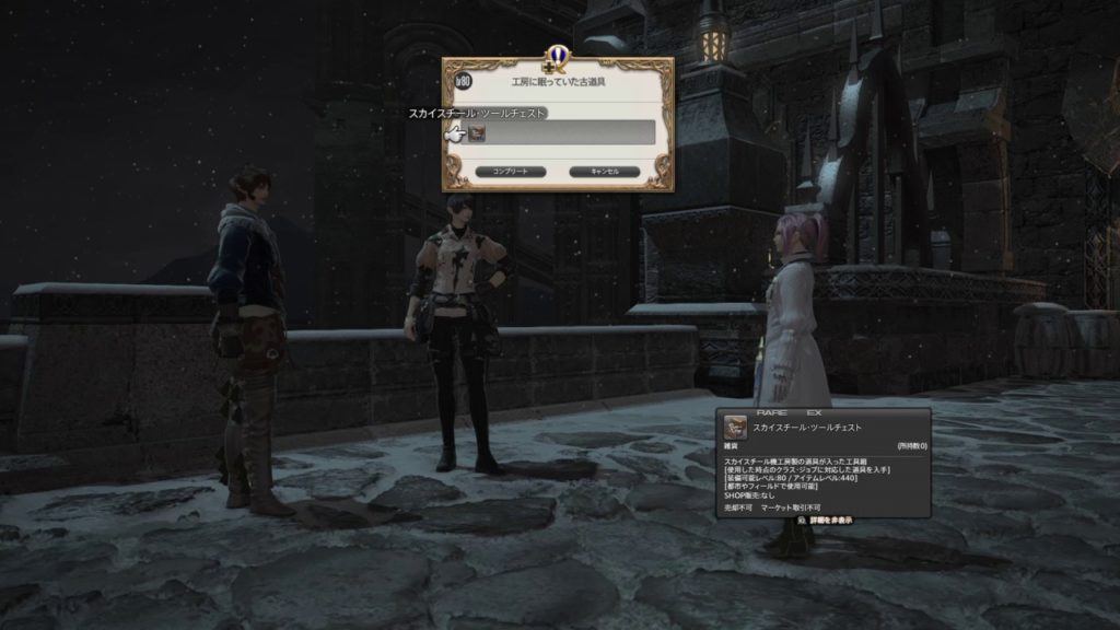 受注クエスト『工房に眠っていた古道具』のコンプリート報酬「スカイスチール・ツールチェスト」を使用すると、最初のスカイスチールツール(未強化)を入手できます。