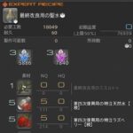 先にも書いたようにエキスパートレシピ製作では、ステータスがいくらあれば安定して製作できるという事はありません。なので基本的には可能な限りフル禁断して、料理や薬を用意して製作に挑むことになります。(逆に言えばより低いステータスでも製作は可能ですが、成功確率が下がります)