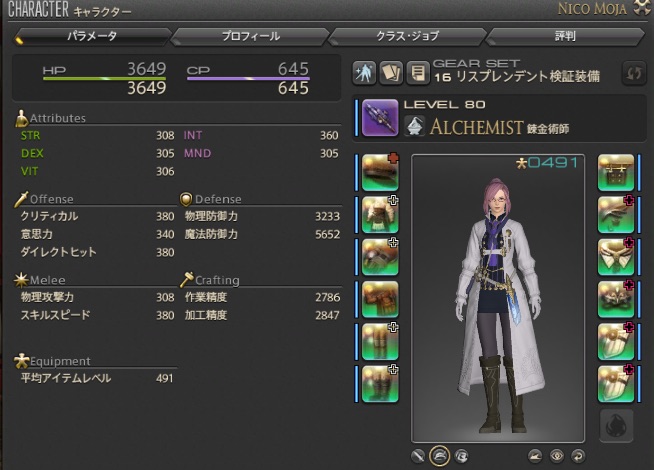 こちらのエースセチック装備フル禁断記事の内容をベースに、主道具をスカイビルダーズ装備(スカイスチールツール最終段階)に変更し、料理「チリクラブHQ」と薬品「魔匠の水薬HQ」を使用した状態のステータスです。