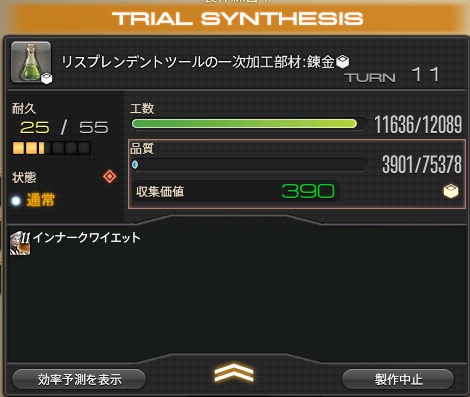自身のステータスと製作している加工部材の種類(第○次)ごとに、仕上げに向かえる耐久・品質・CPを計算しておいて(追って詳細な数値も追記します)、達成できたらフェーズ4に進みます。(詳細は後述)