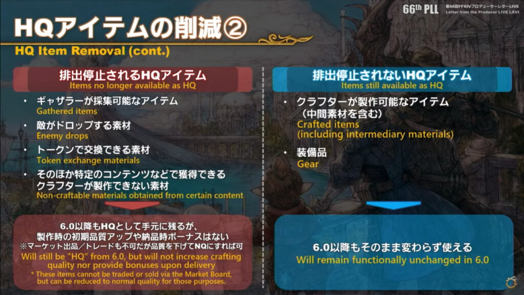 アプデ前時点で所持しているHQアイテムはなくなりはしないが、上記の通り製作時の初期品質アップや納品時ボーナスはなく、マーケット出品やトレードをするにはNQにする必要があるとのこと。