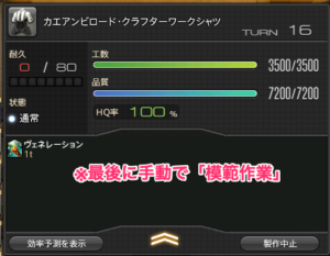このマクロを高品質等の恩恵を受ずに完走した場合、工数3126 / HQ率(品質)100%となり、最後に手動で「模範作業」を使うことで完成します。