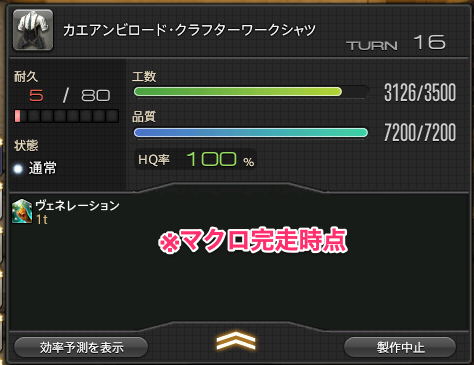 このマクロを高品質等の恩恵を受ずに完走した場合、工数3126 / HQ率(品質)100%となり、最後に手動で「模範作業」を使うことで完成します。