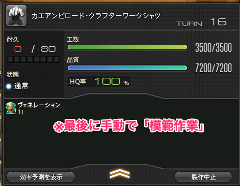 /ac 真価 <wait.3>/ac マニピュレーション <wait.2>/ac 長期倹約 <wait.2>/ac イノベーション <wait.2>/ac 下地加工 <wait.3>/ac 下地加工 <wait.3>/ac 下地加工 <wait.3>/ac 下地加工 <wait.3>/ac イノベーション <wait.2>/ac グレートストライド <wait.2>/ac ビエルゴの祝福 <wait.3>/ac ヴェネレーション <wait.2>/ac 下地作業 <wait.3>/ac 下地作業 <wait.3>/ac 下地作業マクロだけでの消費CPは524ですが、最後に手動で「模範作業(消費CP7)」を使うので、合わせて531となっています。