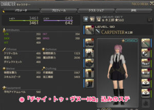 製作時の装備・ステータスは以前紹介したカエアンビロード装備フル禁断例をベースに、若干妥協したステで検証しました。加えて料理「チャイ・トゥ・ヴヌーHQ」を使用した状態で検証しています。