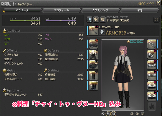 製作時の装備・ステータスは以前紹介したカエアンビロード装備フル禁断例をベースに、若干妥協したステで検証しました。加えて料理「チャイ・トゥ・ヴヌーHQ」を使用した状態で検証しています。