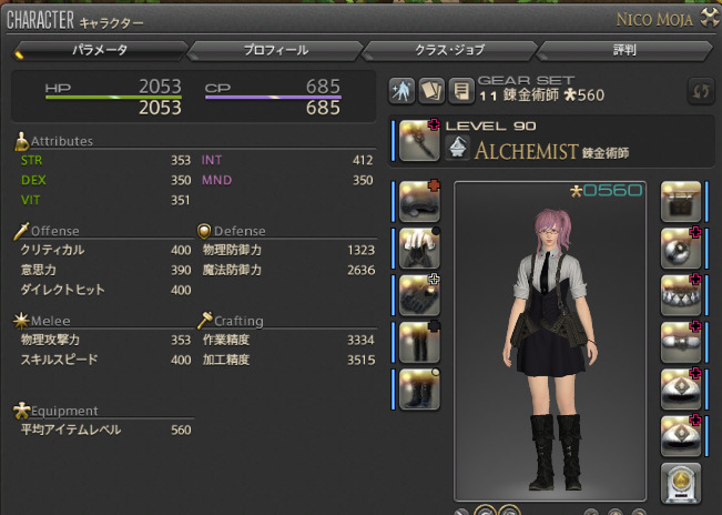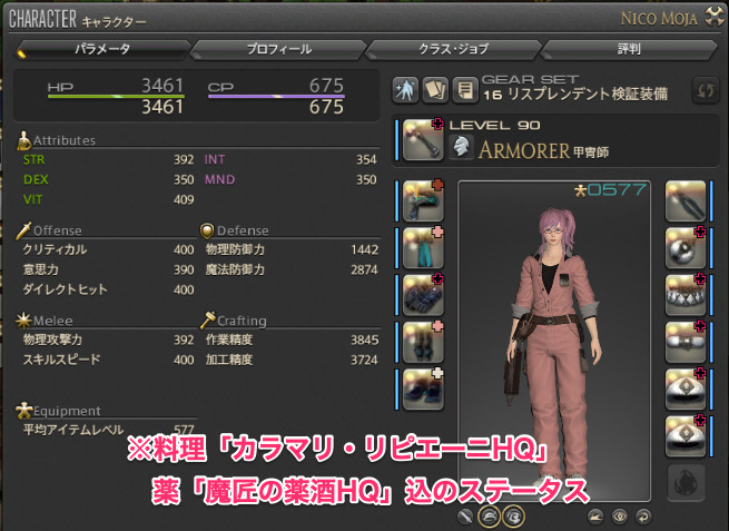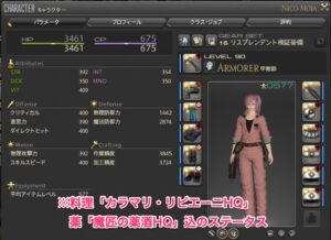 この装備・ステータスに料理「チャイ・トゥ・ヴヌーHQ」と薬品「魔匠の薬酒HQ」等(薬は三次素材マクロのみ必要)を使用した状態で製作検証を行いました。