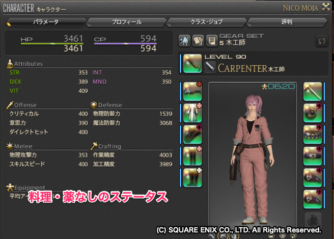 必要CP668は主道具のCPを限界まで盛ってマイスターと併用することで薬なしでも満たせますが、マイスター職で製作するなら後述の最大価値を出せるマイスター専用マクロを使ったほうが良いです。