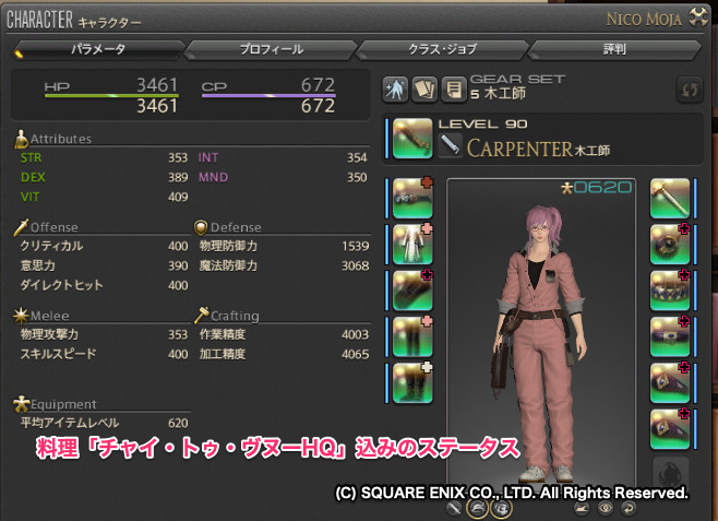 先述の装備・ステータスをベースに、料理「チャイ・トゥ・ヴヌーHQ」と薬品「魔匠の薬酒HQ」等を使用した状態で製作を行います。(このマクロを実行するだけなら「魔匠の水薬HQ」でもCPは足ります。)