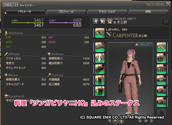 上記の装備・ステータスは、以前紹介した6.1新式装備製作向けのフル禁断例からさらにCP+5、加工精度+12を盛った状態です。下記URLを参考に、主道具5禁目の「魔匠のマテリア」を「魔匠のマテリジャ」以上に付け替え、副道具の5禁目として「巨匠のオメガマテリジャ」を装着することで、目標ステータスを満たすことができます。