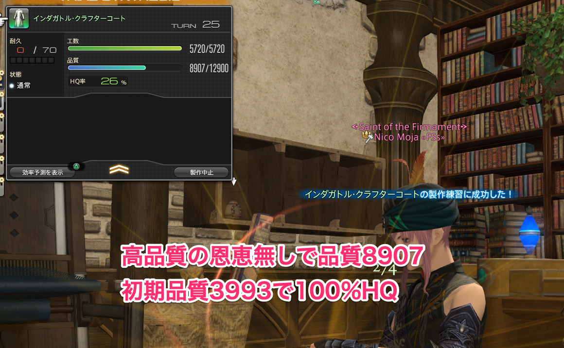 先に紹介したステータスでこのマクロを実行した場合、高品質状態の恩恵を一度もうけなかった場合で品質8907(26%)まで上げることができます。