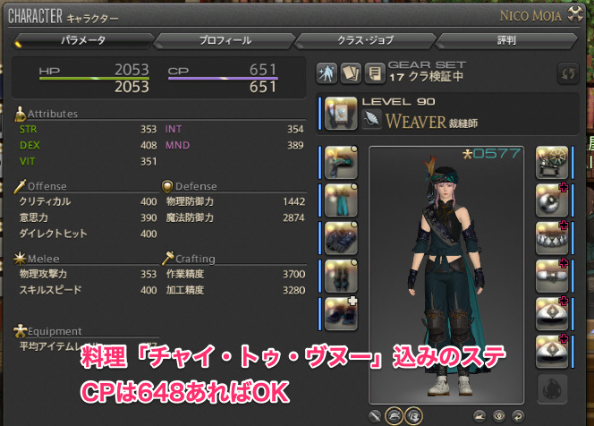 6.1クラフター装備「パクトメーカー装備」をベースに、6.2新式装備製作に必要な下限ステ(作業3700以上、加工3280以上)で検証しました。料理「チャイ・トゥ・ヴヌーHQ」を食べています。