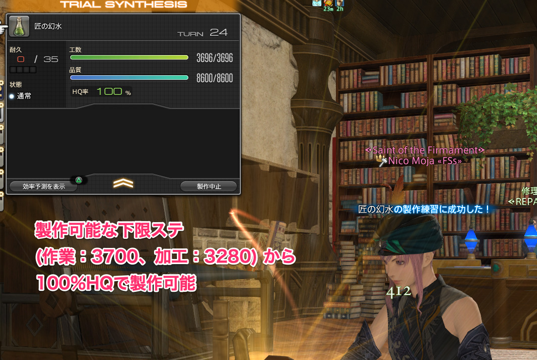 かなり高ステが必要なマクロですが、中間素材をHQで作る必要がないので金策向けの装備・マクロです。