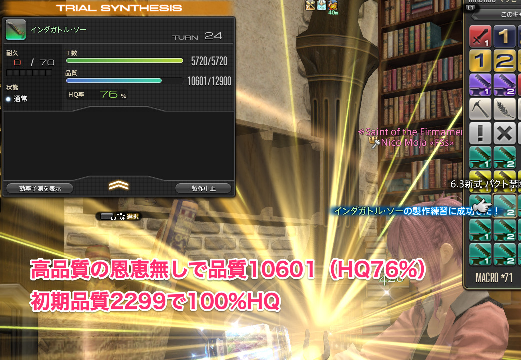 先に紹介したステータスでこのマクロを実行した場合、高品質状態の恩恵を一度もうけなかった場合で品質10601(76%)まで上げることができます。