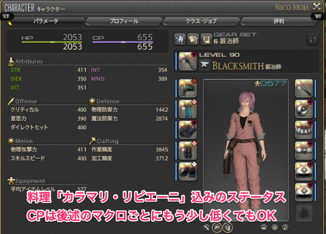 CPはパクトメーカー装備のマテリア装着上限に近い値ですが、その分他ステが低めなのでかなりゆる禁断で達成できるステータスだと思います。CPが足りない場合は薬「魔匠の薬酒」等を使ってください!