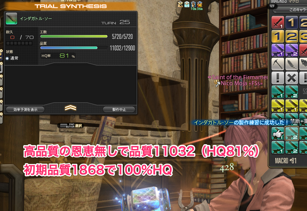 先に紹介したステータスでこのマクロを実行した場合、高品質状態の恩恵を一度もうけなかった場合で品質11032(81%)まで上げることができます。