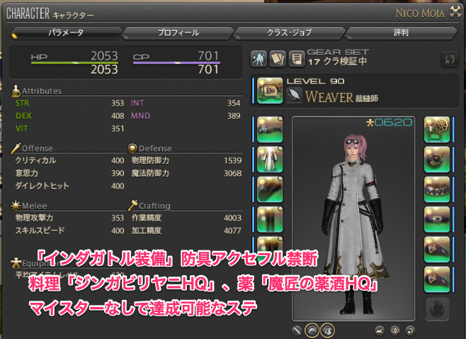 6.3クラフター装備「インダガトル装備」の防具・アクセをフル禁断、道具類を少しだけ禁断したステータスです。料理「ジンガビリヤニHQ」、薬「魔匠の薬酒HQ」を使用しています。