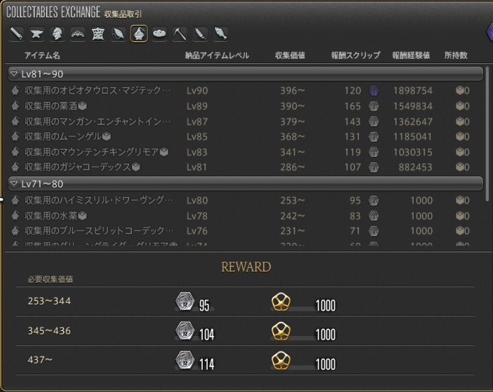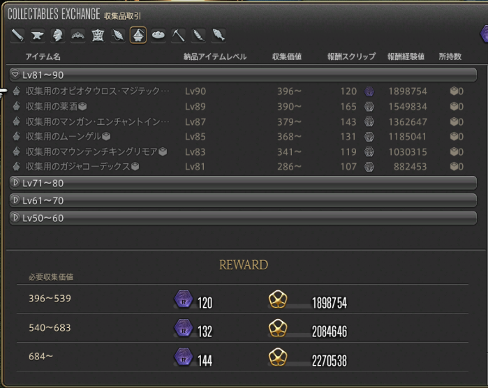 ただこちらはLv80以下の納品アイテムでは白貨しか入手できません。「パーフェクショニスト装備」交換に必要な紫貨を入手するためには紫貨が必要になりますが、Lv90の納品アイテムを作るためにはある程度の装備を整える必要があるので… Lv90までのレベリング過程である程度装備更新していた場合は、こちらも利用するとより早く紫貨を貯めることができます。