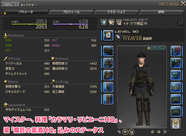 道具・防具がすべてIL590の紫貨交換「パーフェクショニスト装備」、アクセサリがIL500の「セイントハンド装備」、それにマイスター、料理「カラマリ・リピエーニHQ」、薬「魔匠の薬酒HQ」を使ってステータスを底上げしたものです。