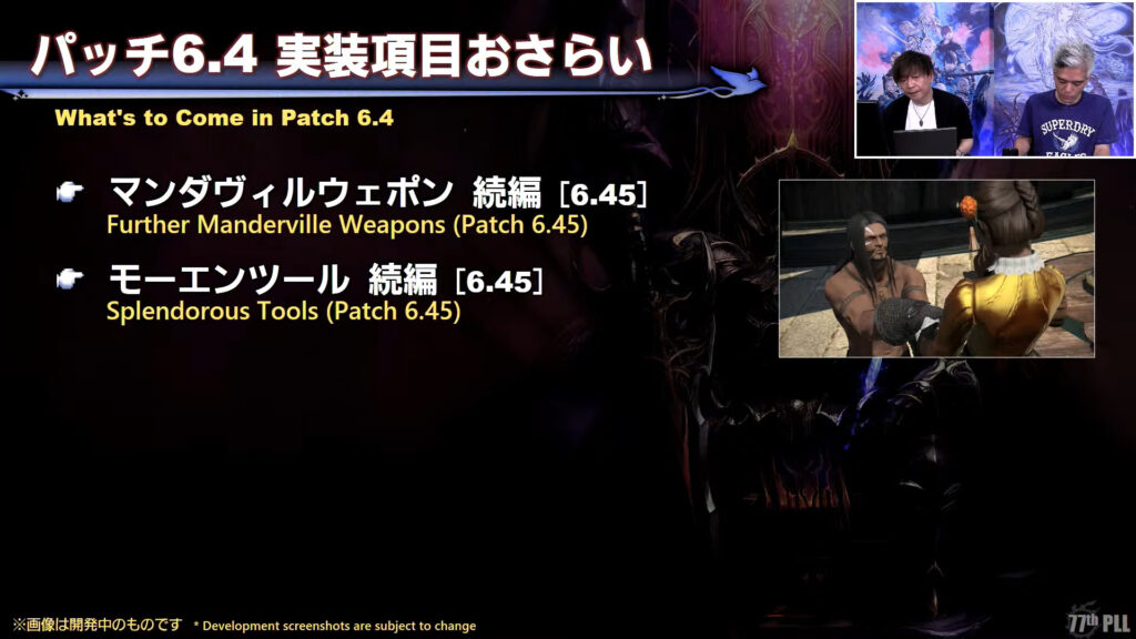 過去の事例として、パッチ6.3ではルビーウェポン武器、6.2ではティターニア武器、6.1ではスサノオ武器が実装されました。