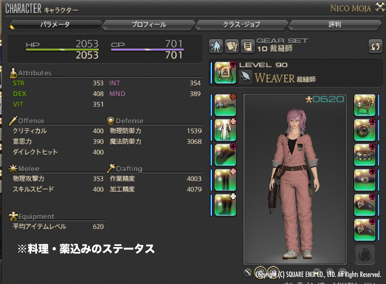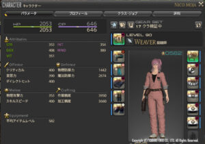 下記記事のフル禁断例のステをベースに、料理「ジンガビリヤニHQ」薬「魔匠の薬酒HQ」を使ったステータスです。