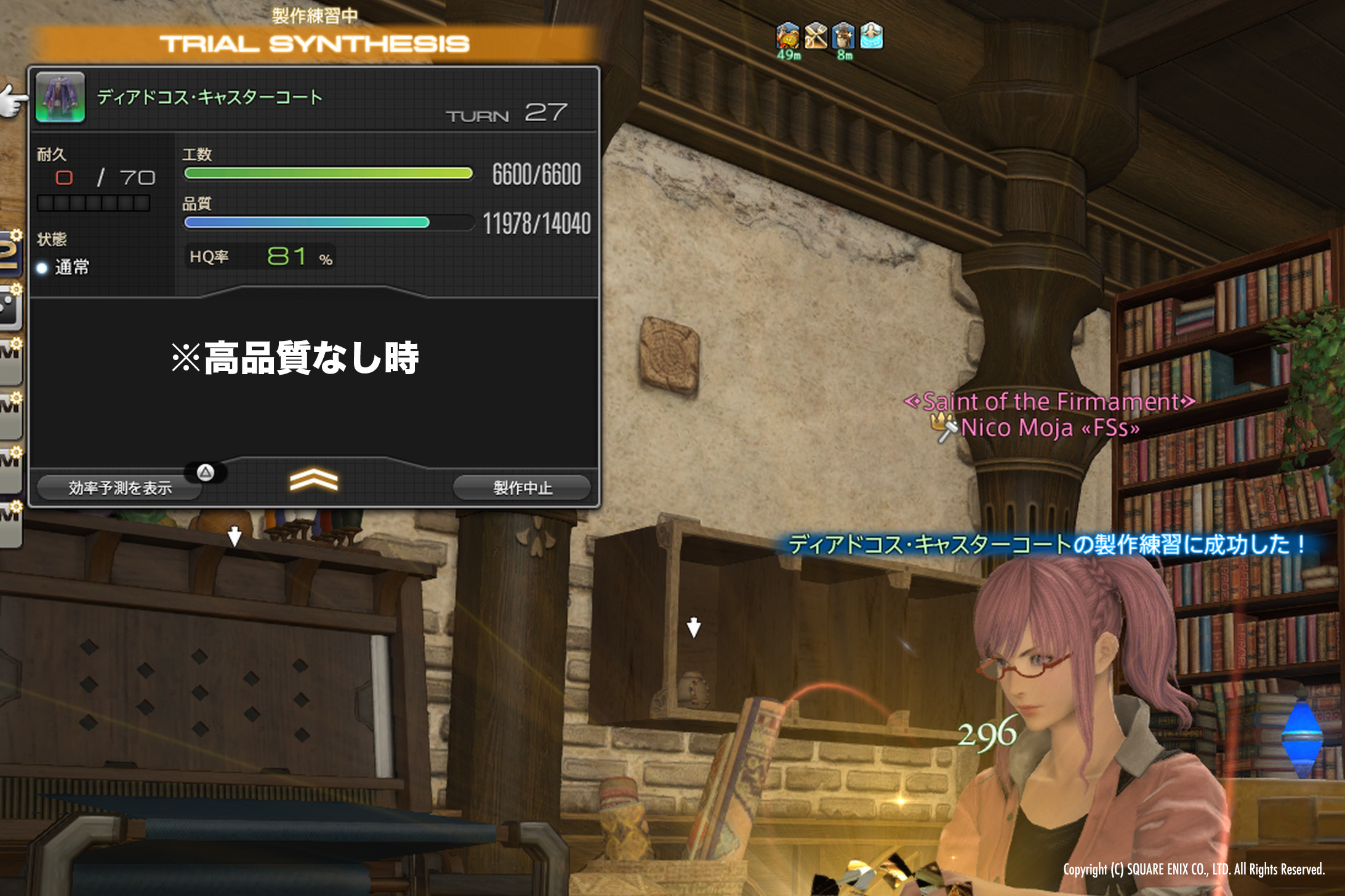 先の紹介したステータスでこのマクロを実行した場合、高品質状態の恩恵を一度もうけなかった場合でも品質100%まで上げることができます。