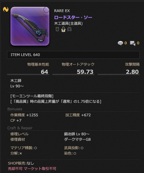ロードスター装備には『「高品質」時の品質上昇量が「通常」の1.75倍になる』という効果がありますが、アプデ後のレベリング時には基本的に「状態にかかわらず確実にHQ完成できるマクロを組んで製作」していくことが主となるため、この場合においてはこの効果がそれほど有用とは言えません。(高難易度製作などではとても有用な効果ではあります)