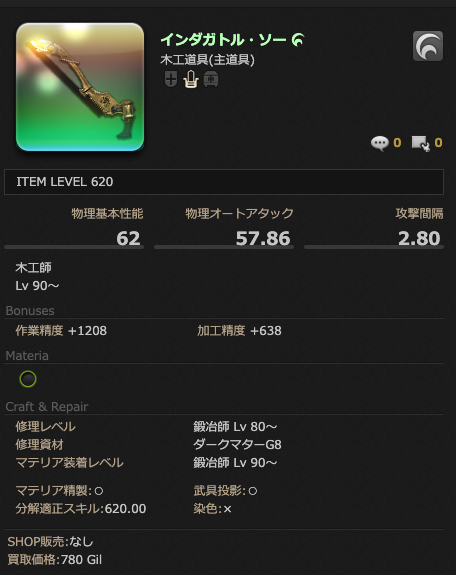 仮にインダガトル装備に「巨匠のアルテマテリジャ(加工+18)・名匠のアルテマテリジャ(作業+27)・巨匠のオメガマテリジャ(加工+12)・名匠のオメガマテリジャ(作業+18)・魔匠のメガマテリジャ(CP+7)」(CPは最大+7なのでメガで十分)とマテリア装着・禁断した場合