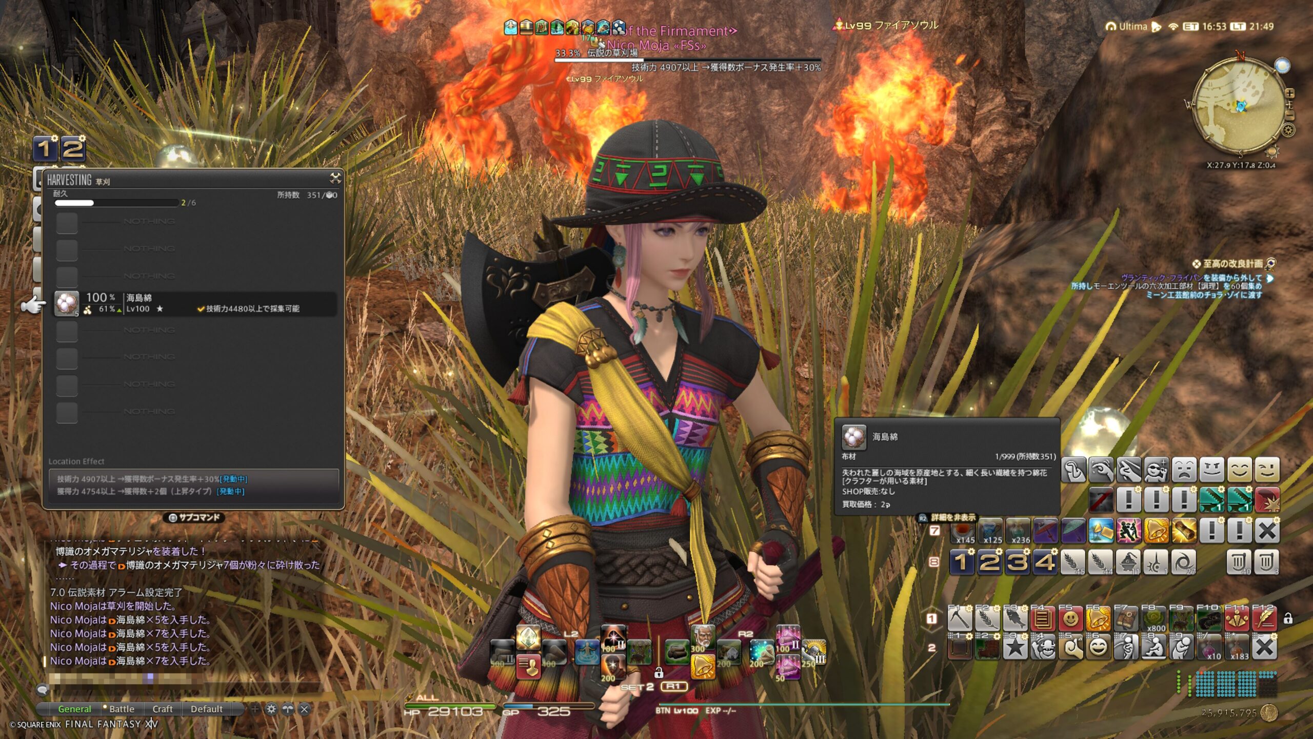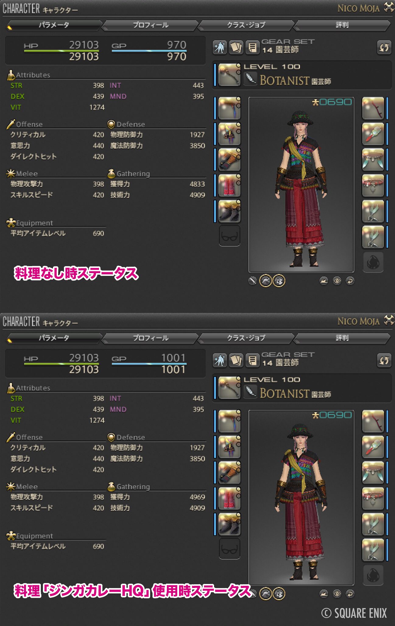 料理無しで7.0伝説の採集の特質ボーナスを達成できき、さらに料理「ジンガカレーHQ」や「トラルパイナップルケーキHQ」を食べることで、さらに上のボーナス「獲得数+2」が出現すると言われている獲得力4968以上を達成できます。