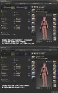 以前の記事で紹介済みの、Lv100製作装備ガチフル禁断例のステータスをベースに、マイスターによるステータスアップ、さらに主道具・副道具にマテリア禁断したステータスです。