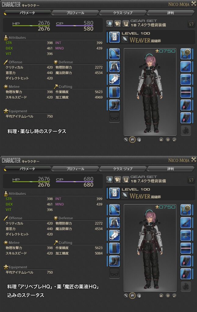 FF14 パッチ7.4で実装された戦闘職向けの新式装備「コートリーラヴァー装備」(IL760)や新しい薬・料理等、そしてそれらの中間素材を、同じくパッチ7.4で実装されたクラフター橙貨交換「スターテック装備」で達成可能なステータスで製作するためのマクロ・スキル回し例です。