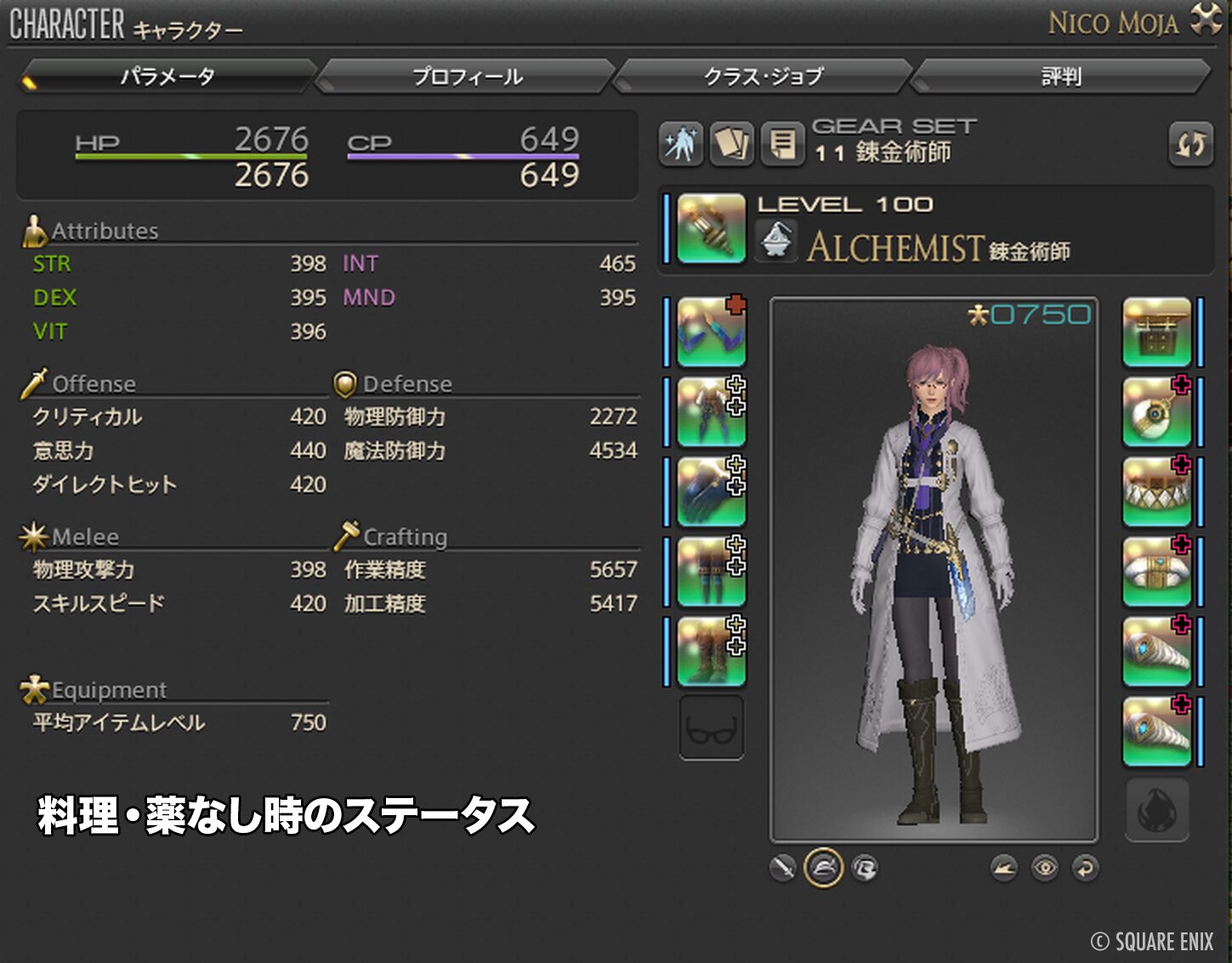 別記事で紹介済みの、7.3ギャザクラ新式「ピーコック装備」フル禁断例のステータスです。主道具はコスモツール第14段階「スペース装備」でも同じステータスなので問題ありません。