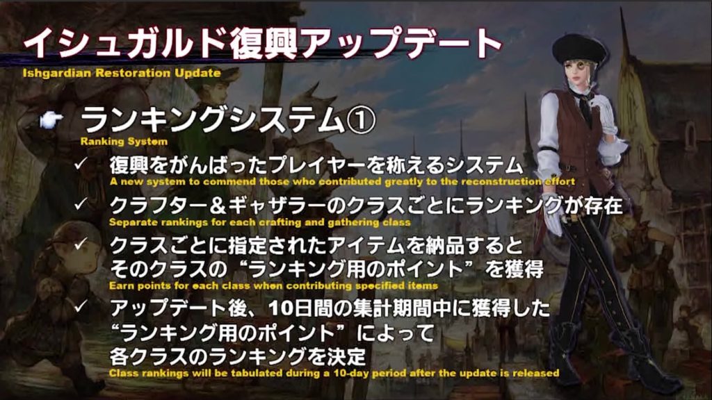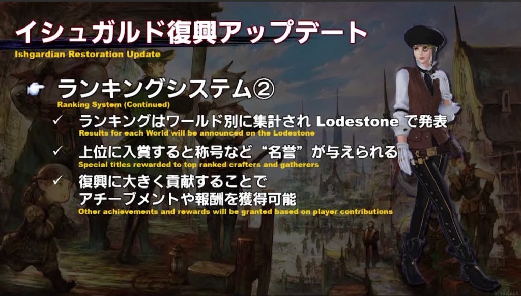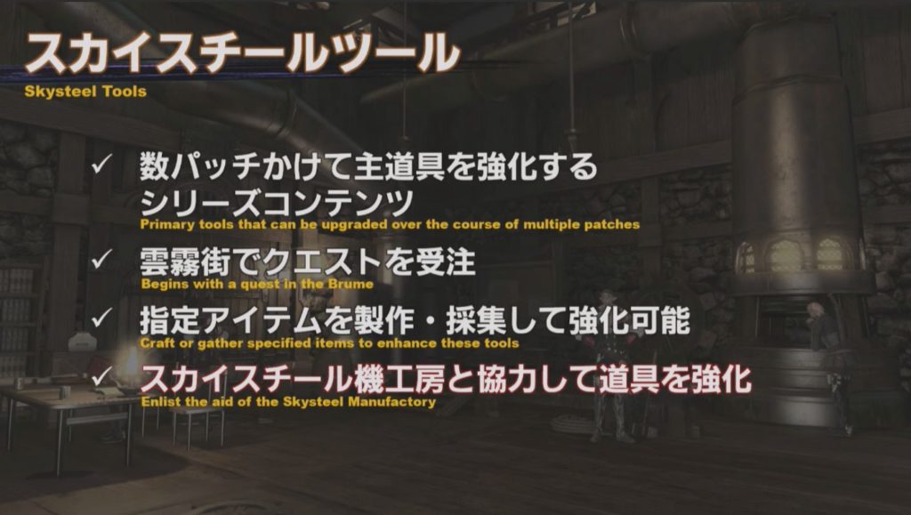 かつてイシュガルドで名工と呼ばれた人たちが使っていた伝説の道具の設計図が見つかり、スカイスチール機工房と協力してより良い道具を作ることで復興に貢献したいというストーリー。